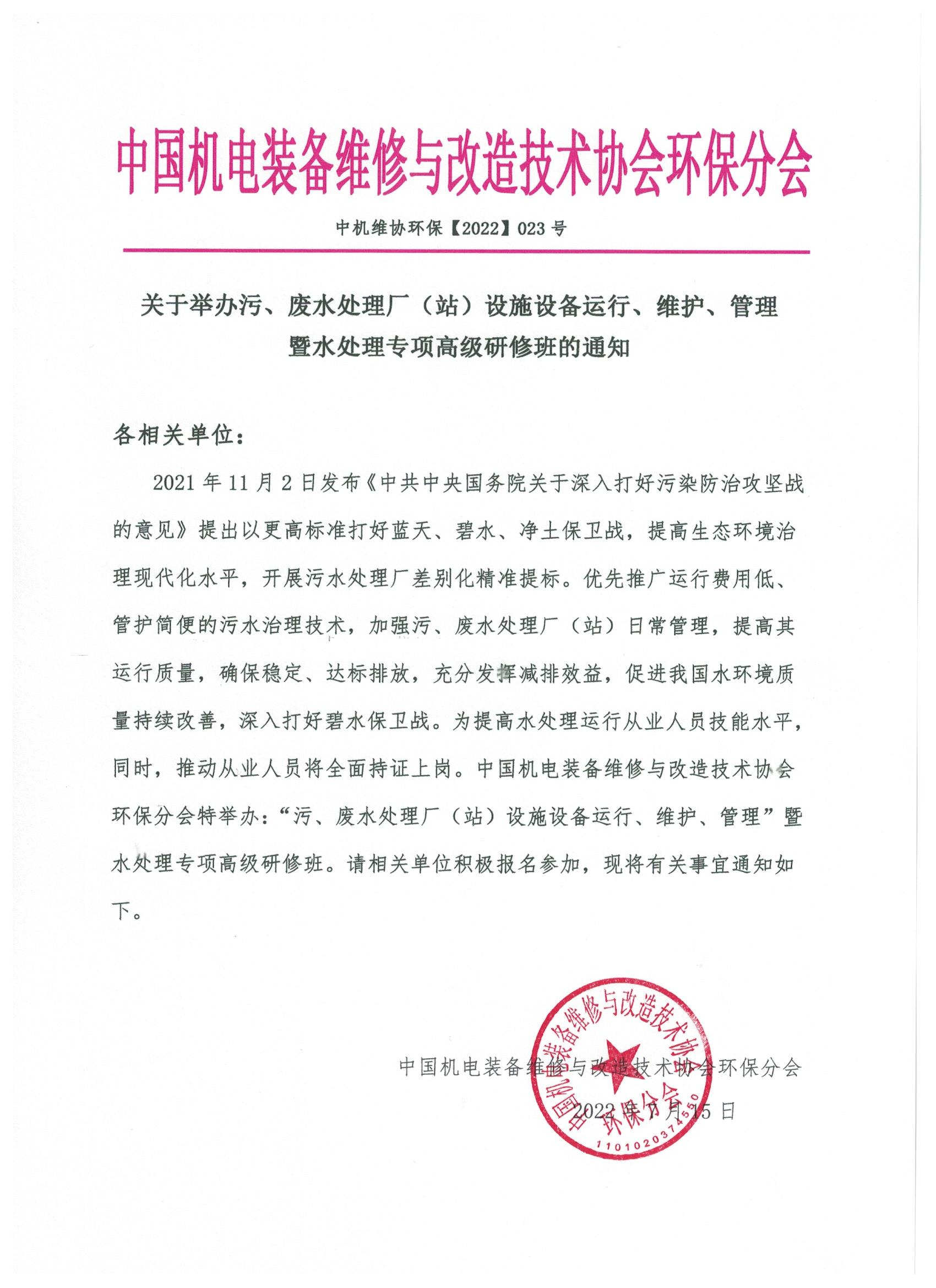 關(guān)于舉辦污、廢水處理廠(站)設(shè)施設(shè)備運行、維護、管理”暨水處理專項高級研修班的通知!