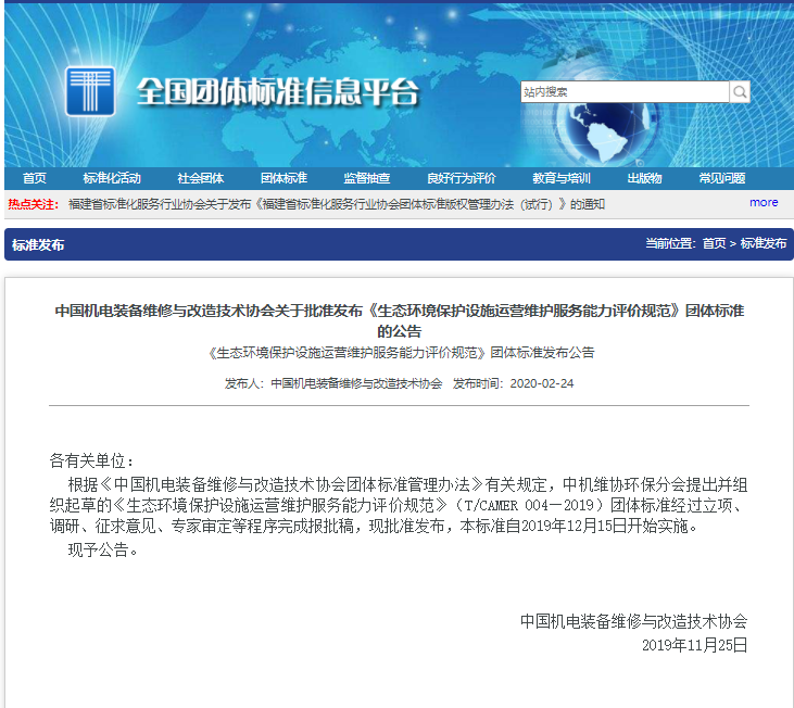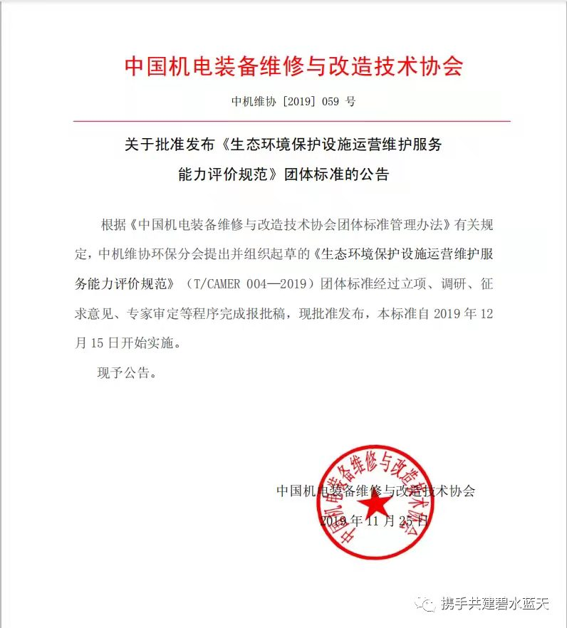 由中國機(jī)電裝備維修改造技術(shù)協(xié)會(huì)發(fā)起,聯(lián)合河北省環(huán)保治理運(yùn)營行業(yè)協(xié)會(huì)、佛山市中環(huán)環(huán)保技術(shù)研究中心、中機(jī)國際工程設(shè)計(jì)研究院有限責(zé)任有限公司華東分院、廣東敏義環(huán)境科技有限公司、深圳市環(huán)境治理光電產(chǎn)業(yè)有限公司、佛山攸威光電科技有限公司、山東領(lǐng)先機(jī)械制造有限公司、山東濟(jì)寧精誠科技有限公司、山東棗莊遠(yuǎn)程環(huán)??萍加邢薰?、石家莊科林威爾環(huán)??萍加邢薰疽约笆仪f曼特水處理有限公司共同起草的《生態(tài)環(huán)境保護(hù)設(shè)施運(yùn)營維護(hù)服務(wù)能力評(píng)價(jià)規(guī)范》團(tuán)體標(biāo)準(zhǔn),于2019年11月25日獲批發(fā)布,并于2019年12月15日正式實(shí)施。